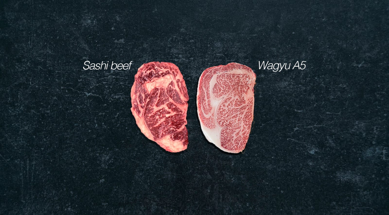 When examining the steak visually, the amount of intramuscular fat is an immediate eye-catcher. In terms of texture and tenderness while tasting, one will experience a silky-smooth sensation that is quite comparable to Japanese A5 Wagyu. When talking about the flavor palate, Sashi beef leans slightly more towards the beefy side, while Japanese A5 Wagyu generally leans more towards the juicy, buttery and fatty side.